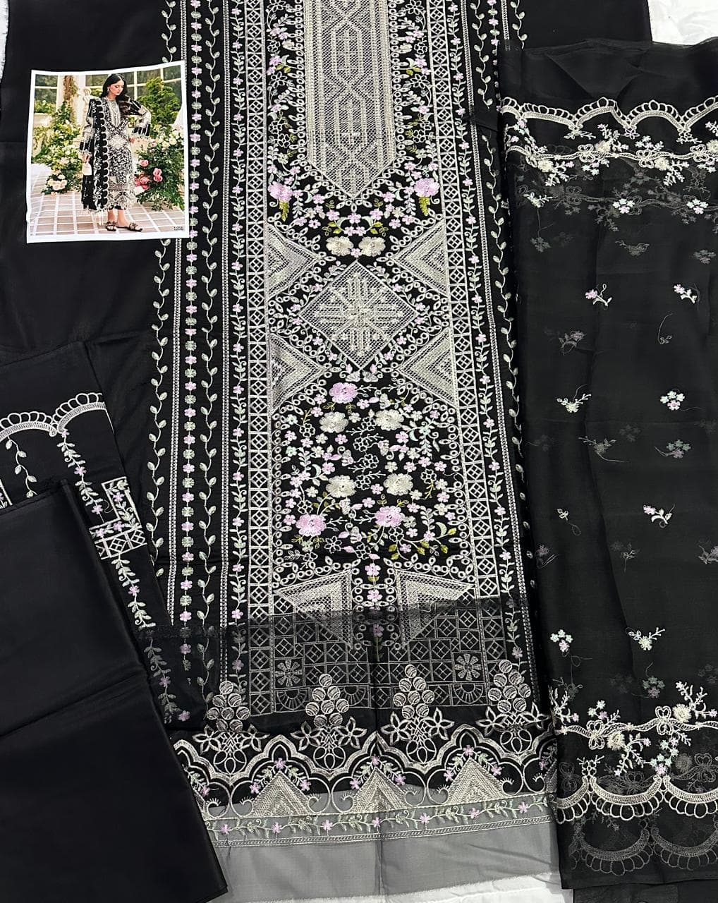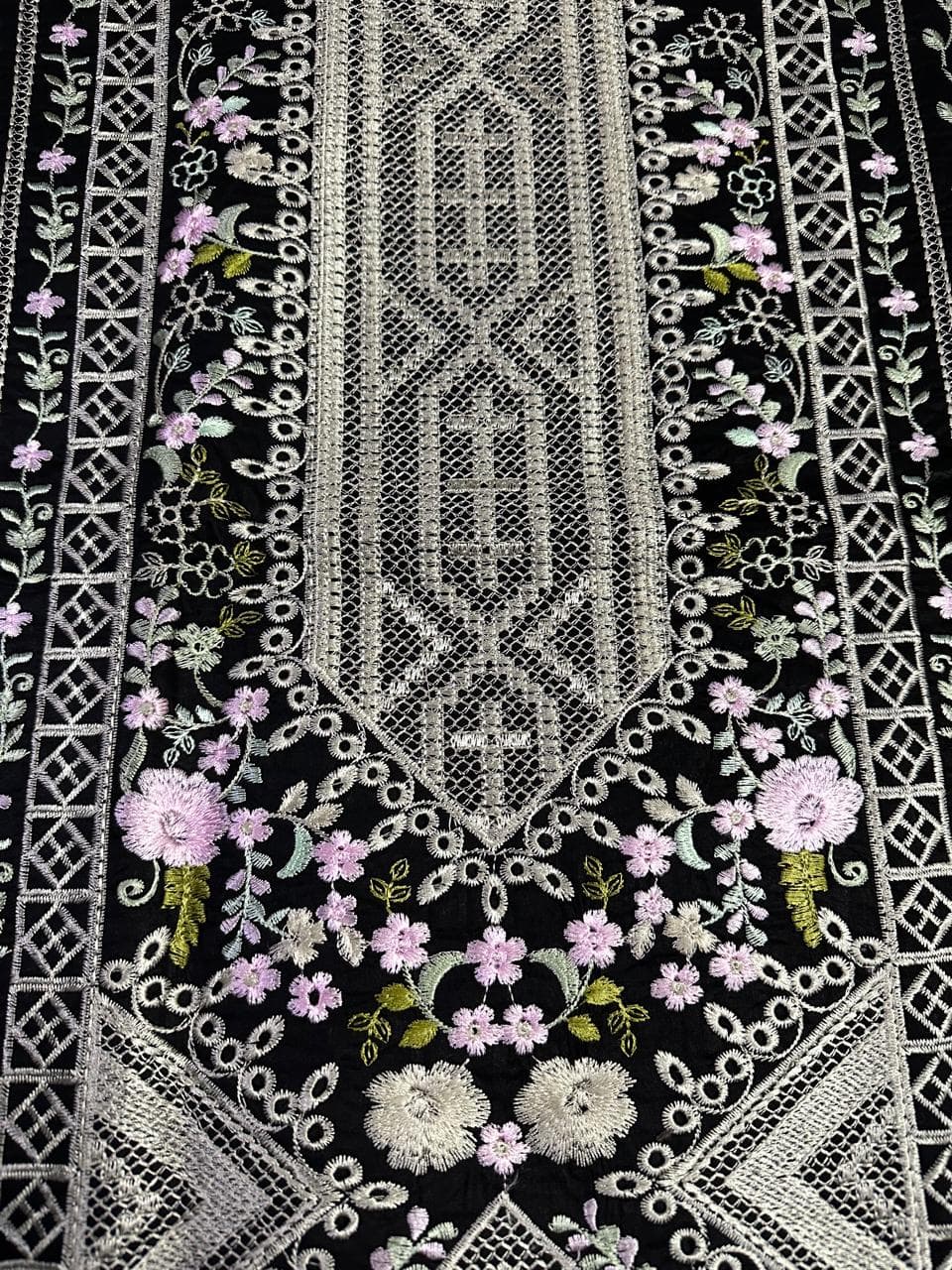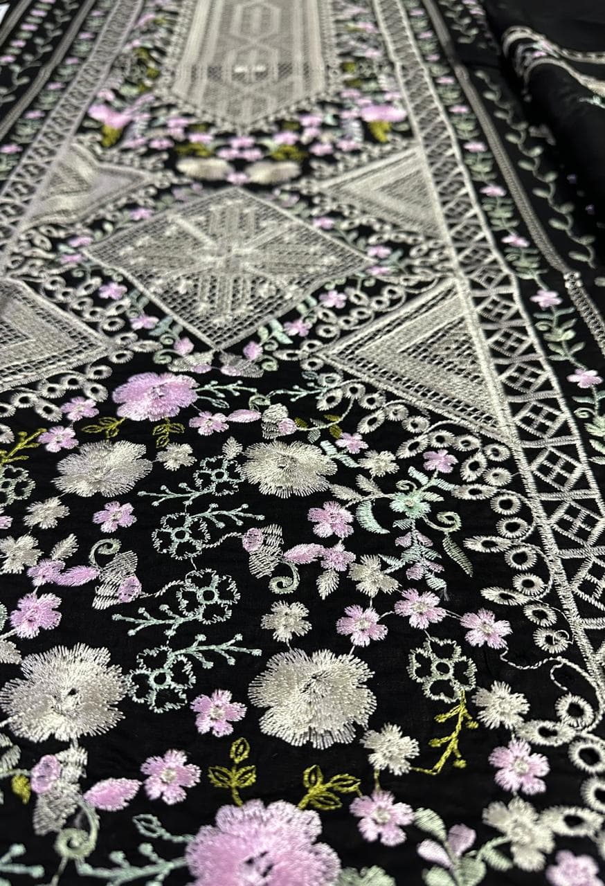 Fabric: 100% Premium Lawn Color: Black Work: Full Embroidery 3 Piece Unstitched Suit Includes: Embroidered Full Front Shirt Front Panel Patch Embroidered Sleeves Embroidered Dupatta Plain Trouser