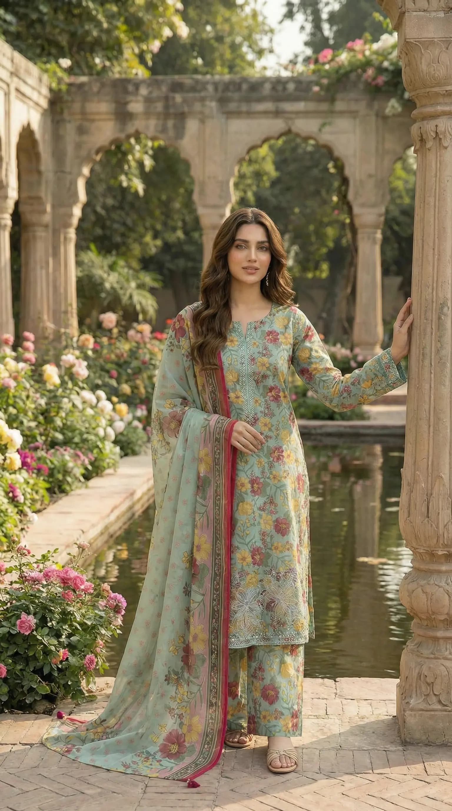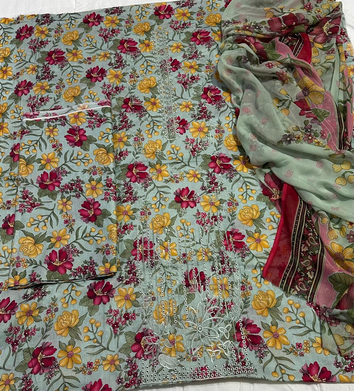 Fabric & Print Details Shirt: Floral printed lawn shirt with embroidery Trouser: Printed lawn trouser Dupatta: Chiffon dupatta Suit Type: 3 Piece Unstitched