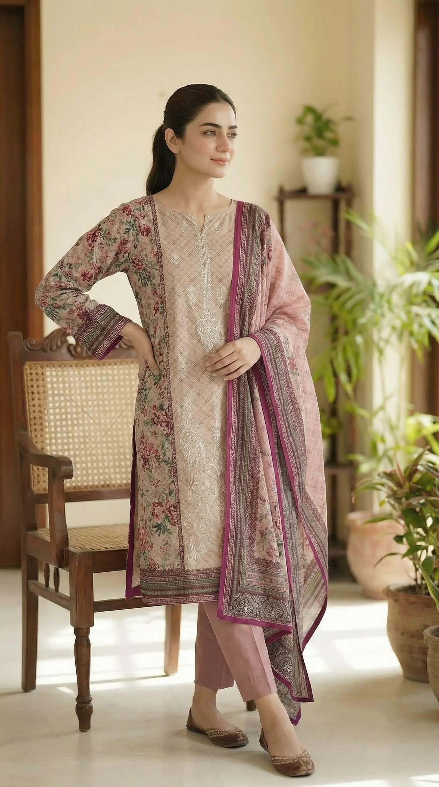 Pink-Printed Lawn 3 Piece Suit with Plain Trouser, Embroidered Shirt & Lawn Dupatta
