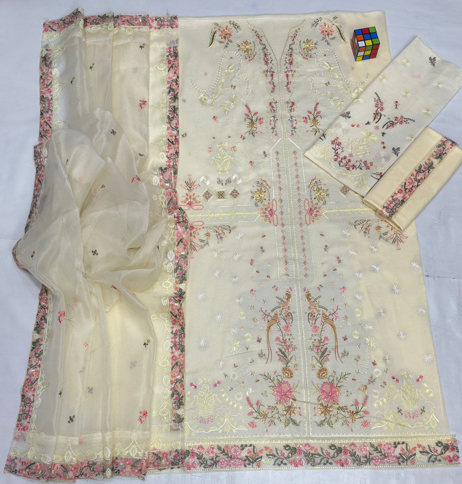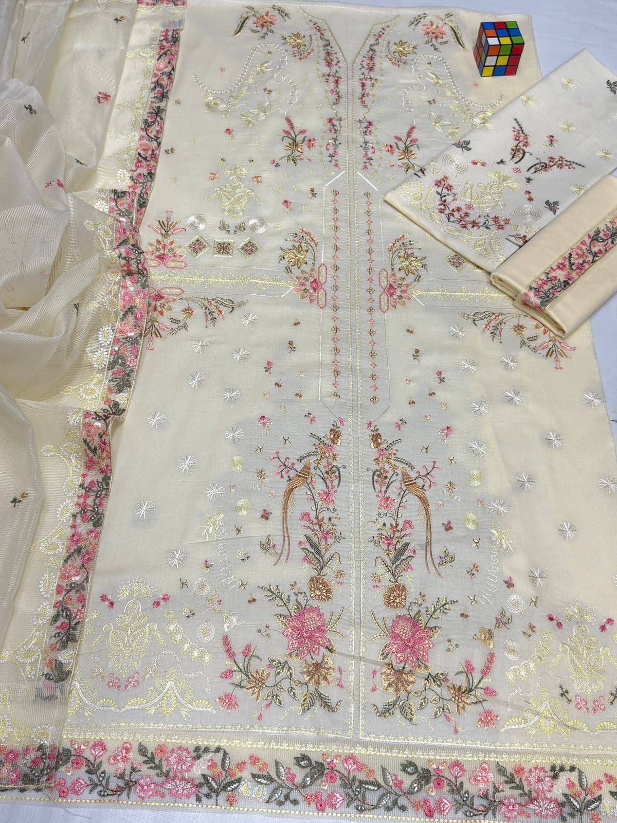 Premium Embroidered 3 Piece Lawn Suit with Net Dupatta & Front Sleeve Patches