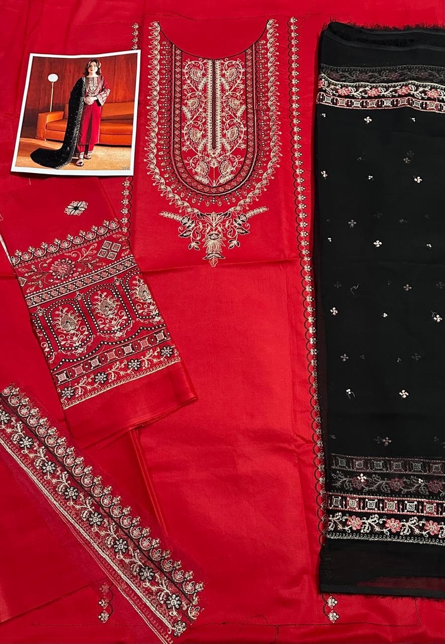 Patch & Embroidery Details Shirt: Neck embroidery and full sleeve embroidery Dupatta: Chiffon dupatta with delicate embroidery Trouser: Embroidered patches for a coordinated look Fabric: 100% High-Quality Lawn Pieces: 3 Piece Unstitched Suit Color: Red Style: Comfortable, breathable, perfect for casual, formal, and festive occasions