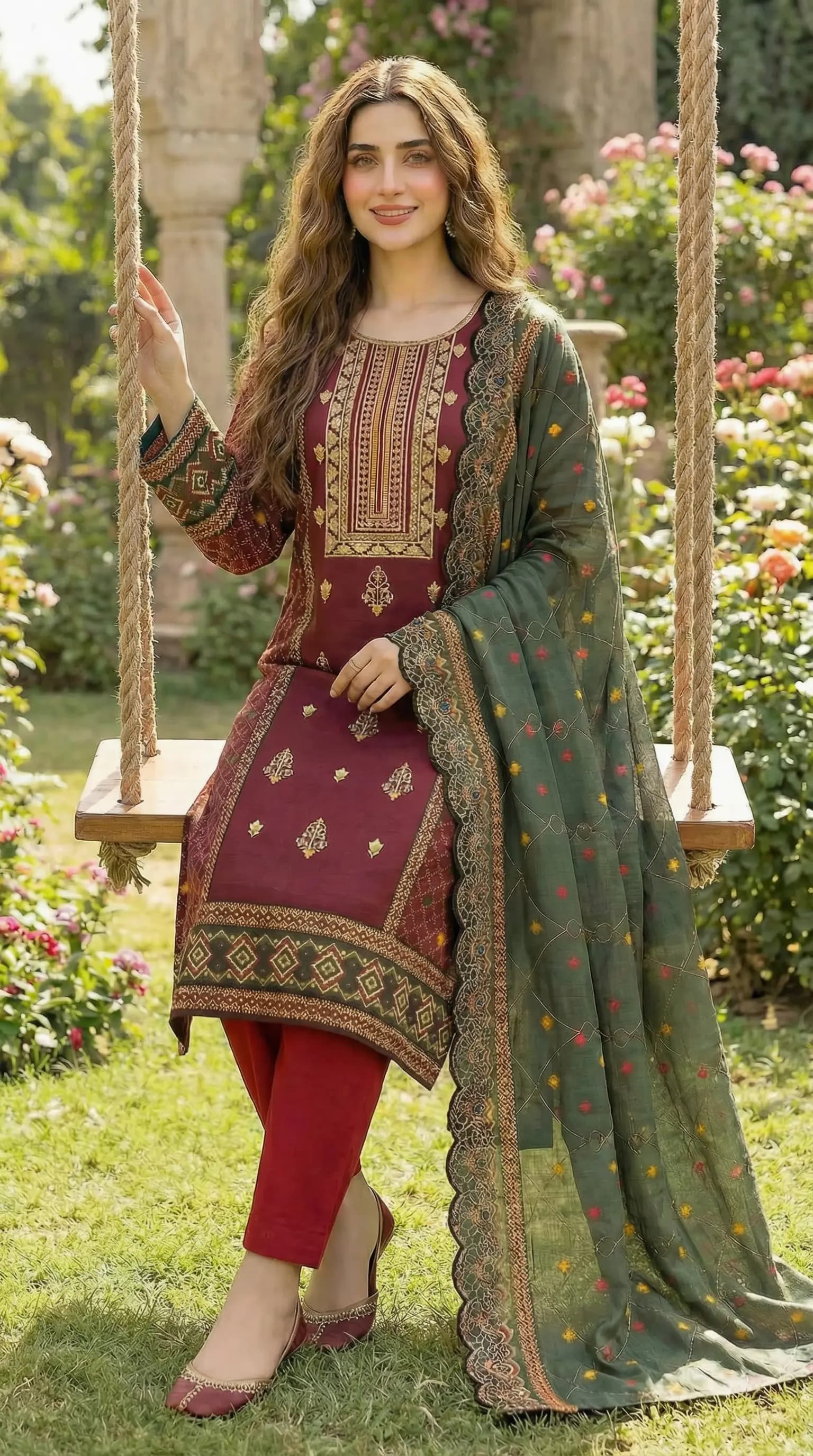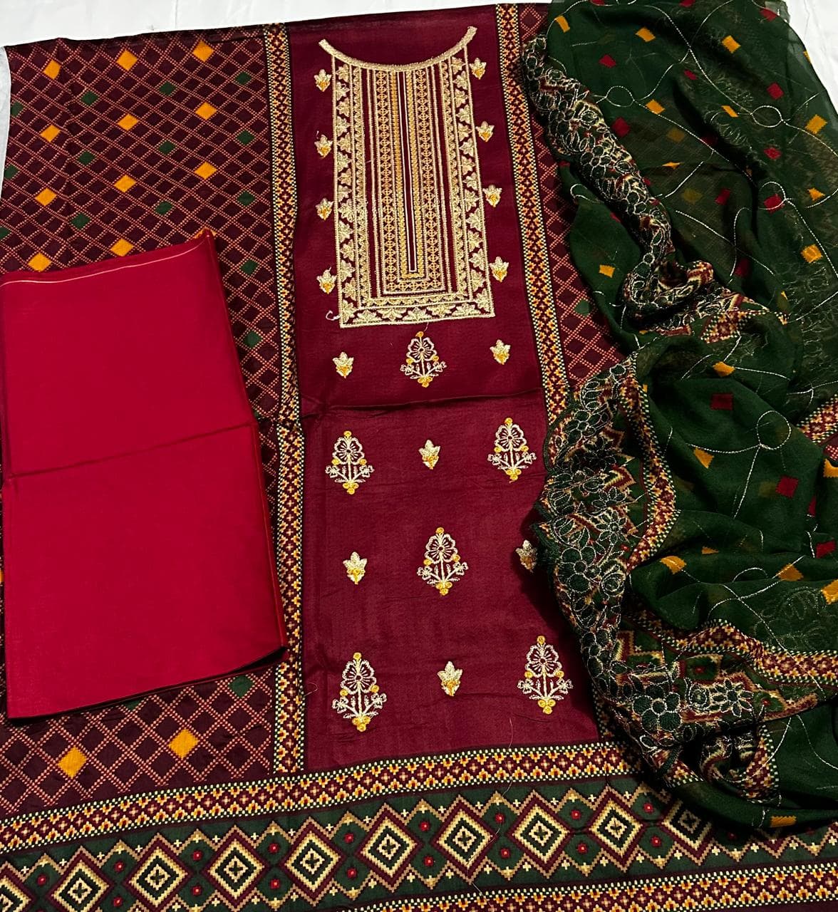 Patches & Details: Printed lawn shirt with fine embroidery Premium quality, soft and breathable lawn fabric Plain lawn trouser for a clean, elegant look Lightweight chiffon dupatta with delicate cut-work Unstitched 3 piece women suit Ideal for Pakistani summer wear