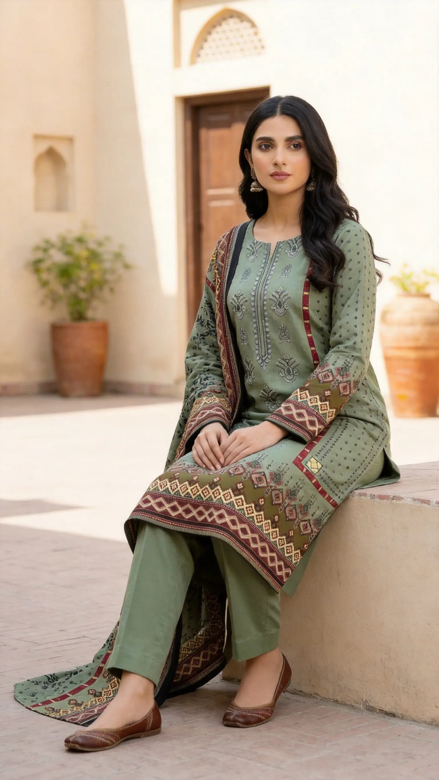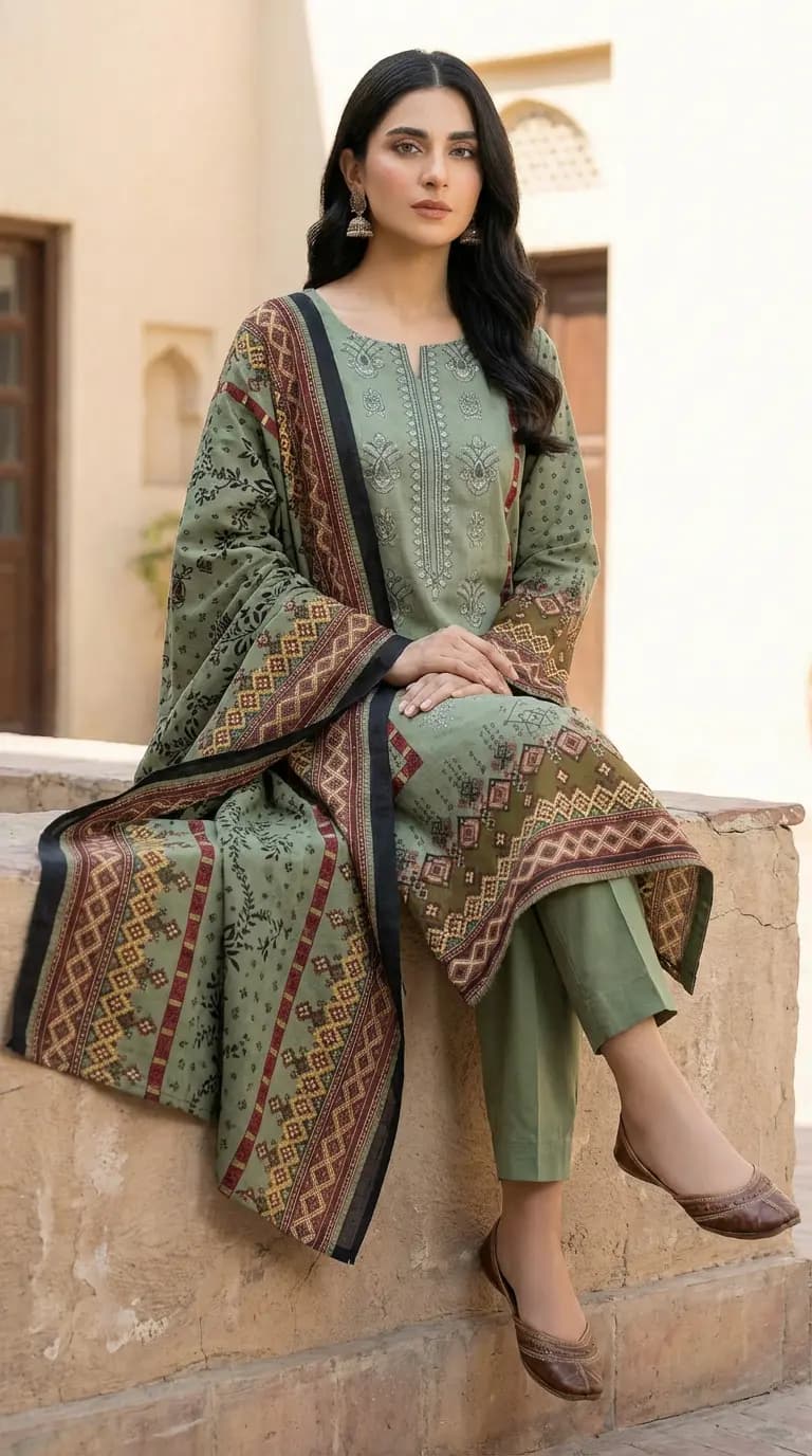 22% offA comfortable printed lawn 3 piece suit perfect for everyday summer wear, featuring an embroidered lawn shirt, a plain trouser, and a matching lawn dupatta.