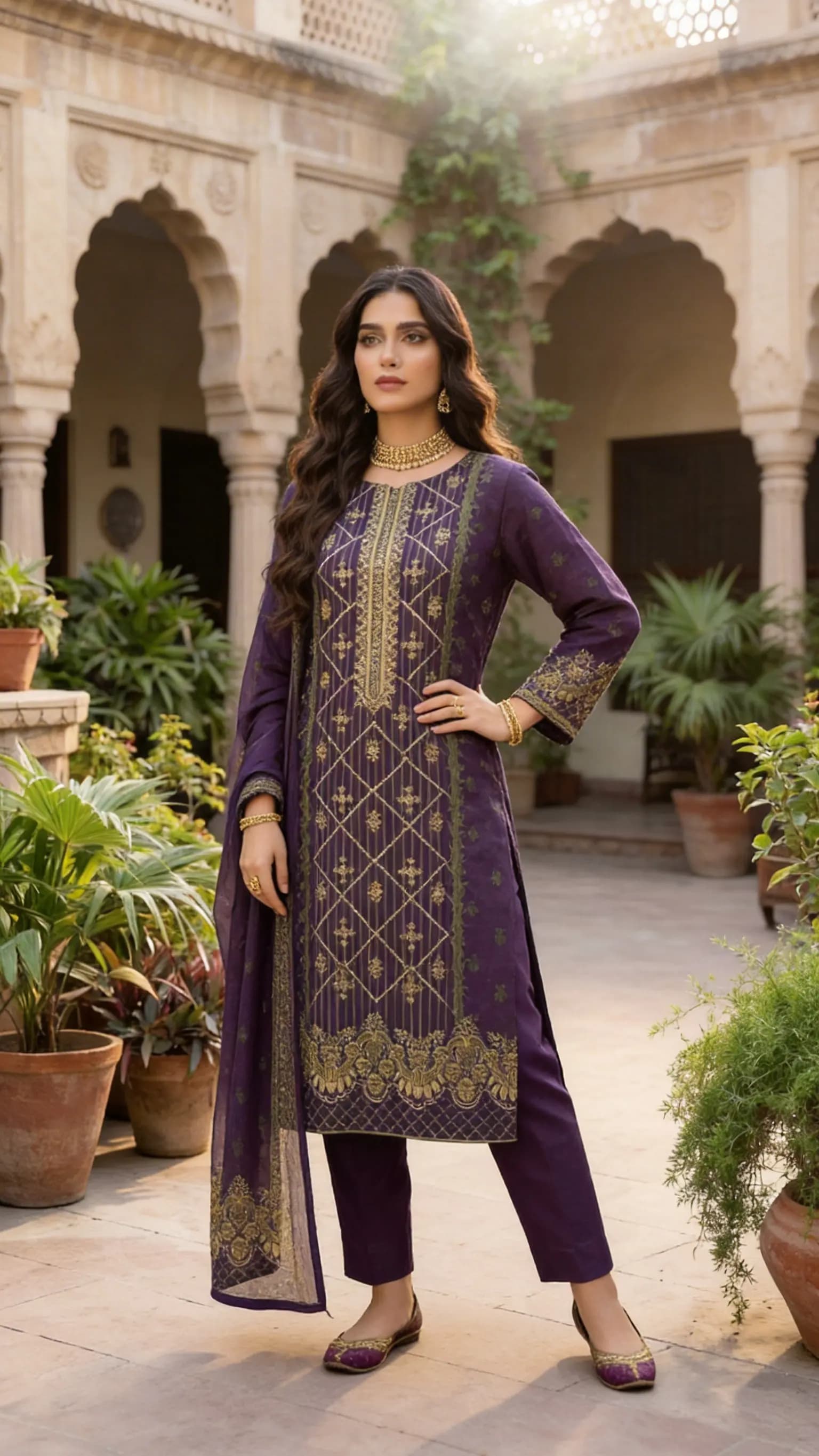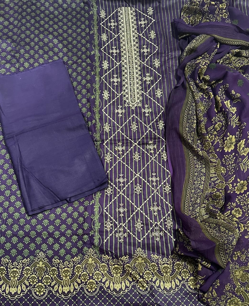 Patches & Details Printed lawn shirt with elegant embroidery Premium quality, breathable lawn fabric Printed lawn trouser for a coordinated look Lightweight chiffon dupatta Unstitched 3 piece women suit Ideal for summer wear in Pakistan