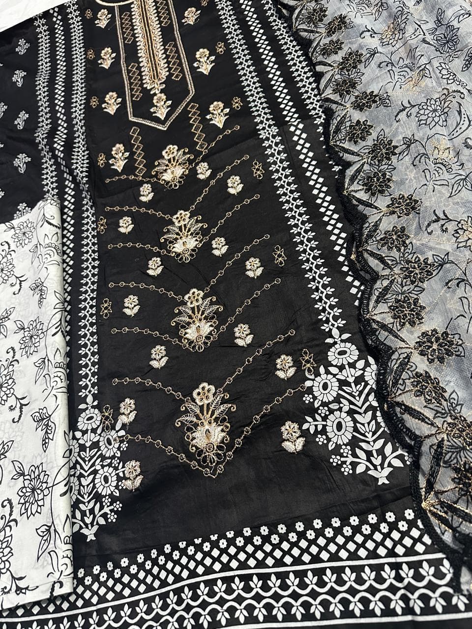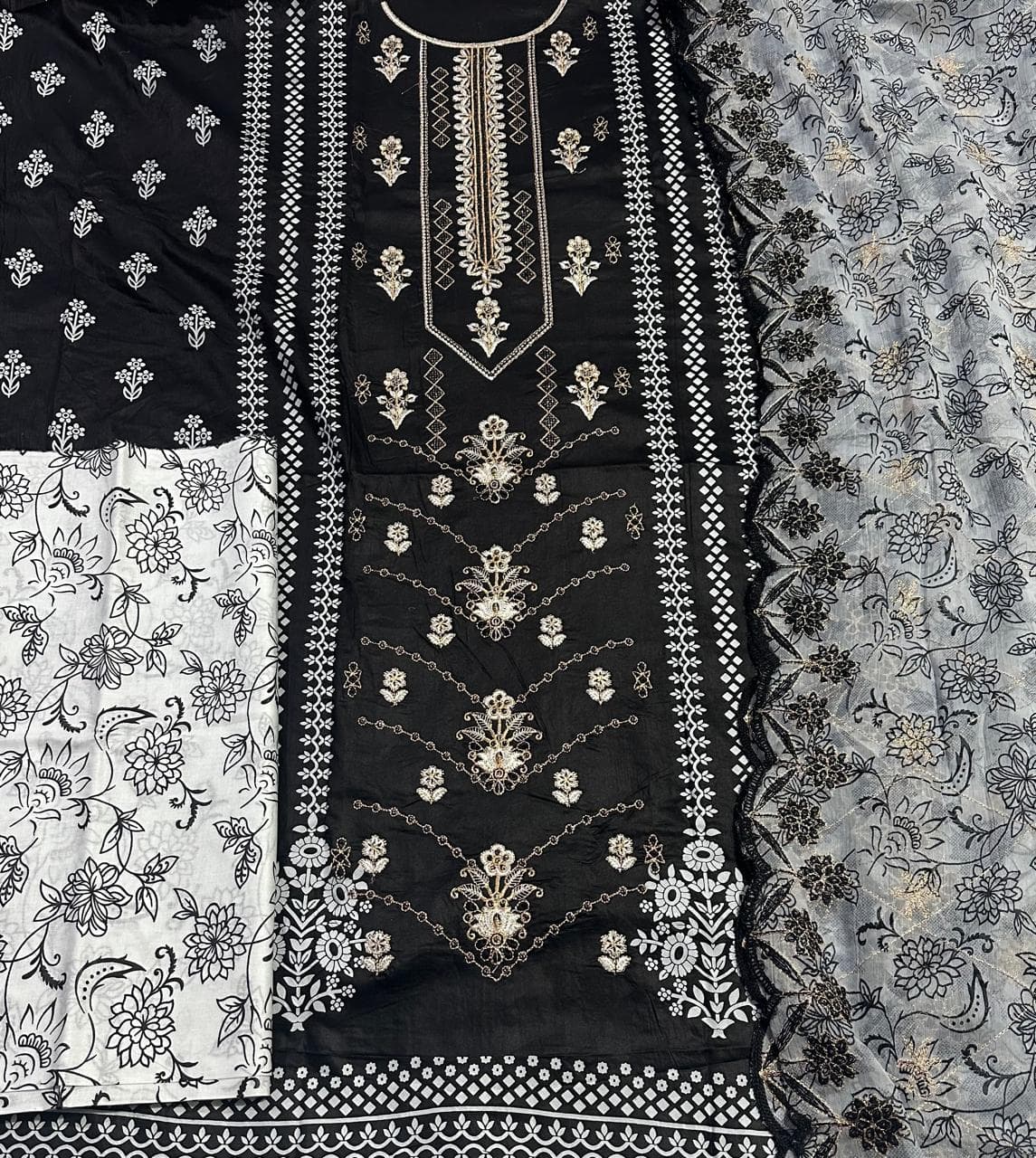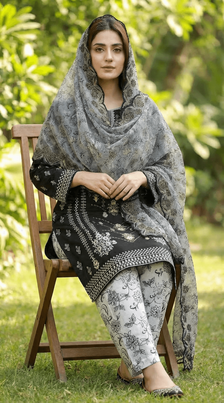 23% offAn elegant printed lawn 3 piece suit designed for summer comfort, featuring a finely embroidered shirt, a matching printed trouser, and a chiffon dupatta finished with delicate cutwork.