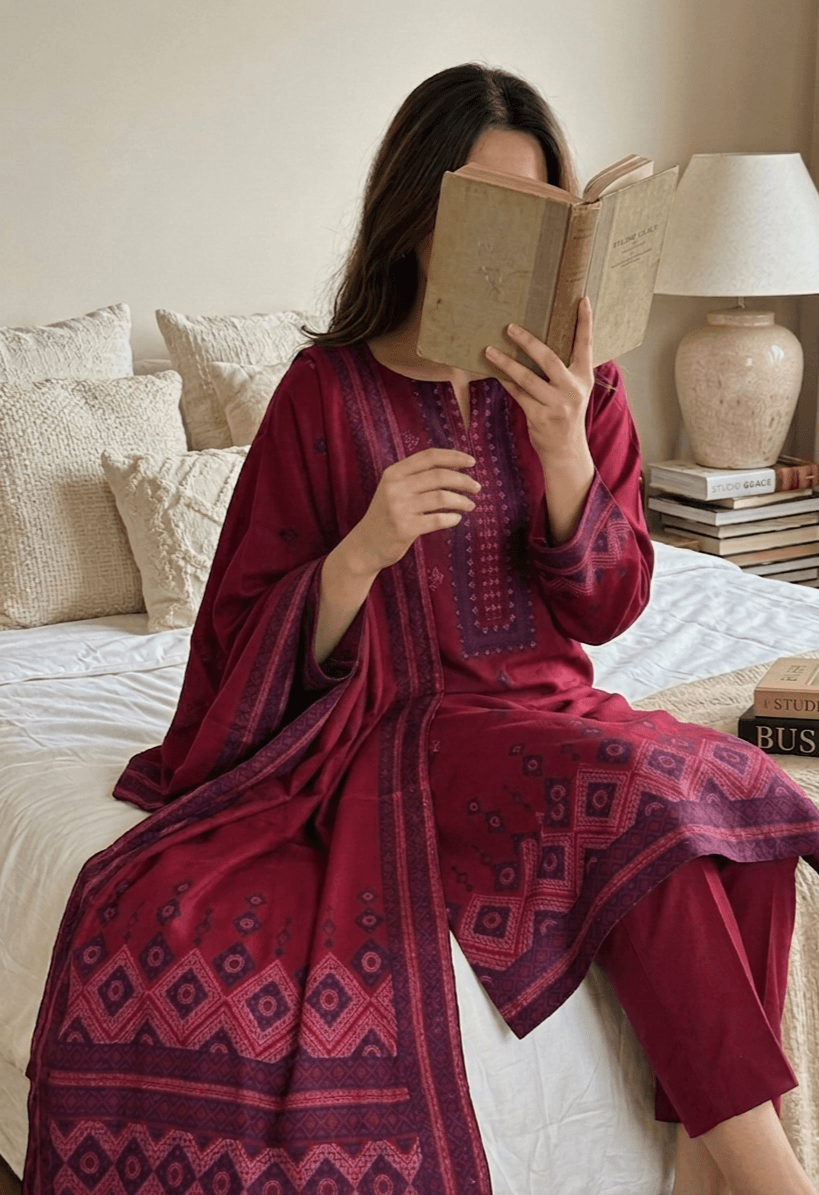 23% offThis top quality jacquard 3 piece lawn dress in Maroon offers a premium textured finish with a sophisticated look, perfect for summer wear and semi-formal occasions.