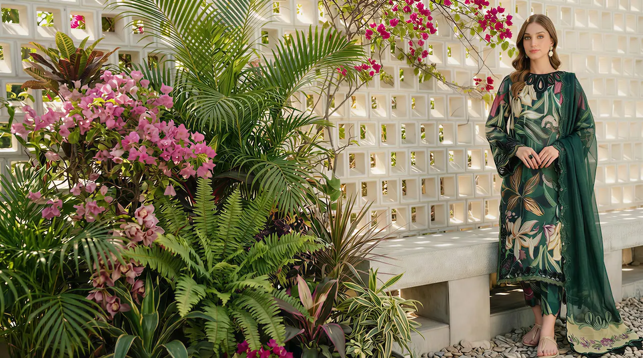 Leaves Printed Lawn 3 Piece Suit with Printed Trouser & Chiffon Dupatta