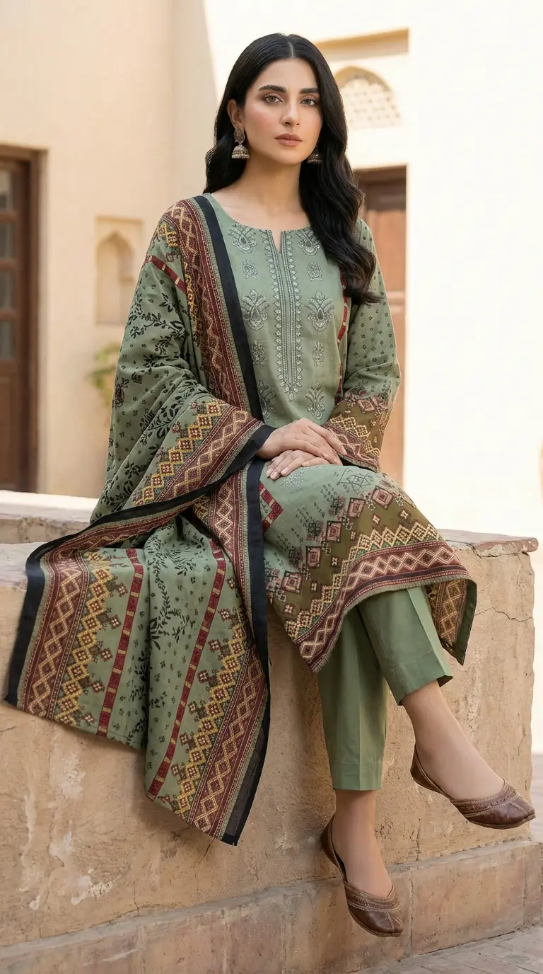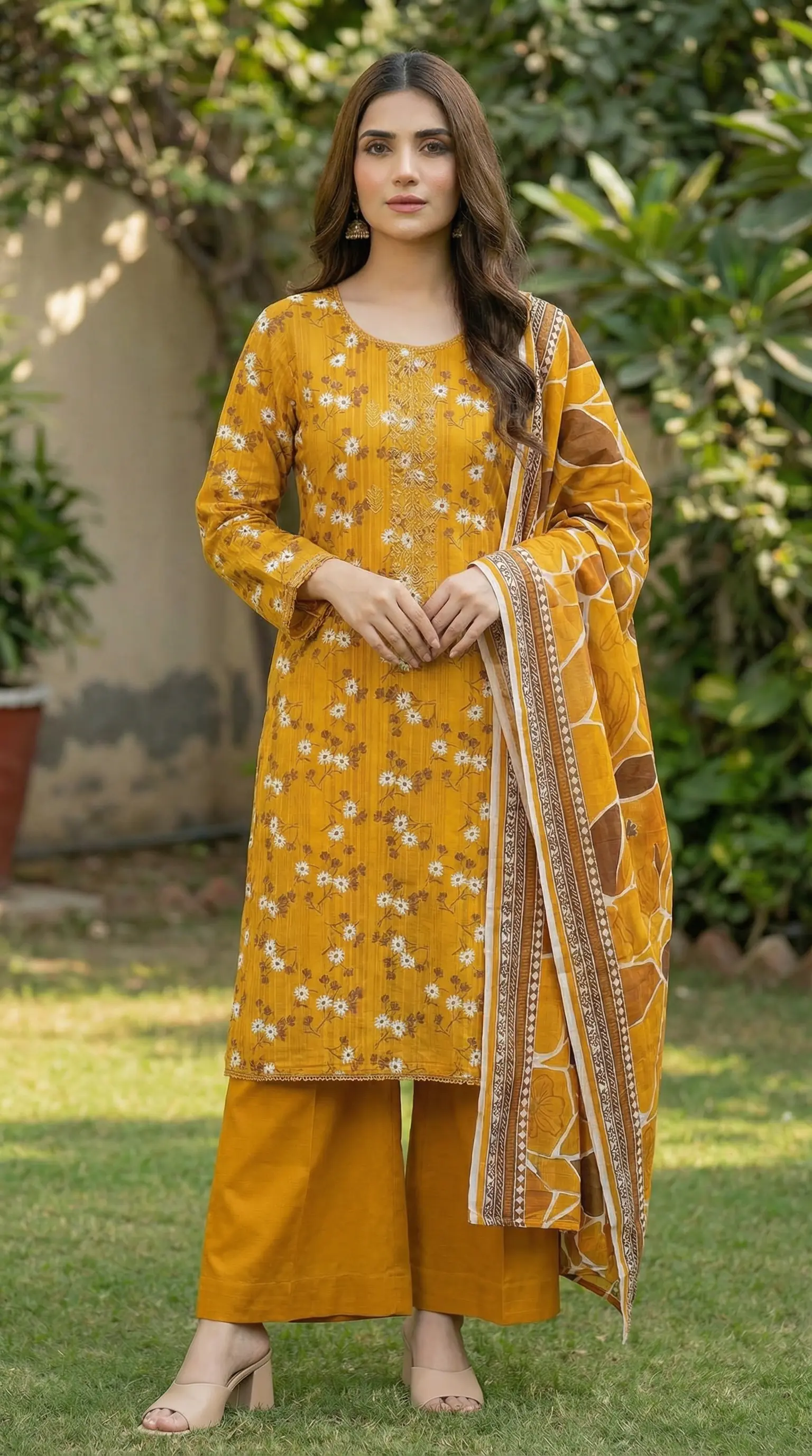 Printed Lawn 3 Piece Suit with Plain Trouser, Embroidered Shirt & Lawn Dupatta
