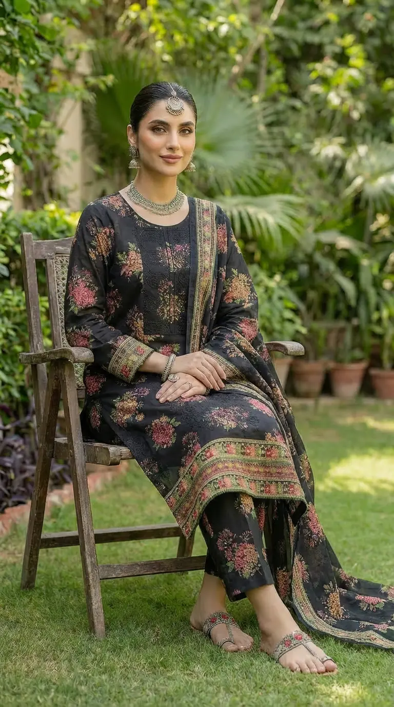 Black Printed Lawn 3 Piece Suit with Plain Trouser, Embroidered Shirt & Chiffon Dupatta with Cut-Work