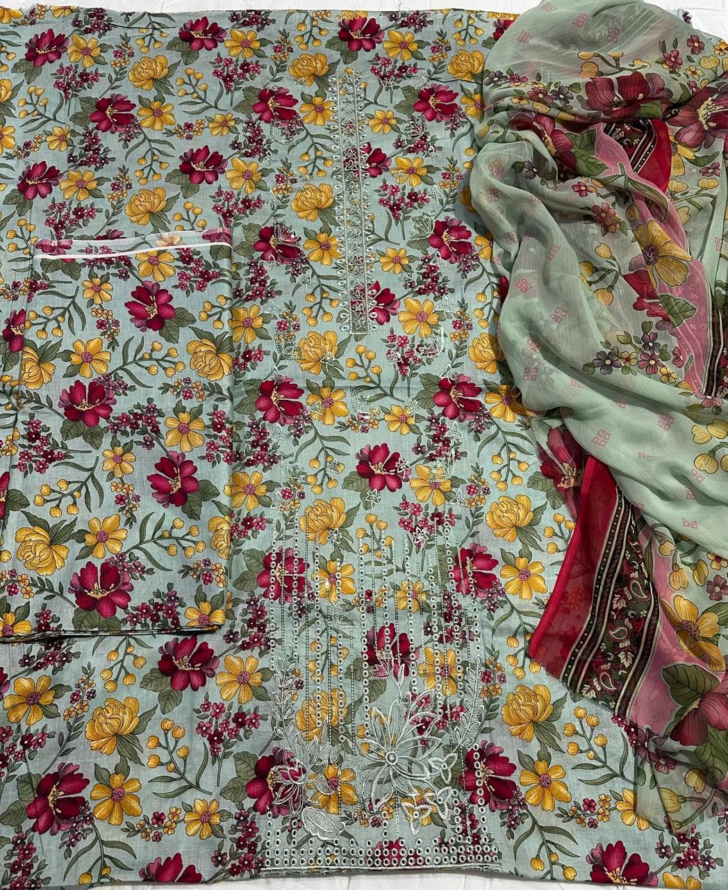 Fabric & Print Details Shirt: Floral printed lawn shirt with embroidery Trouser: Printed lawn trouser Dupatta: Chiffon dupatta Suit Type: 3 Piece Unstitched