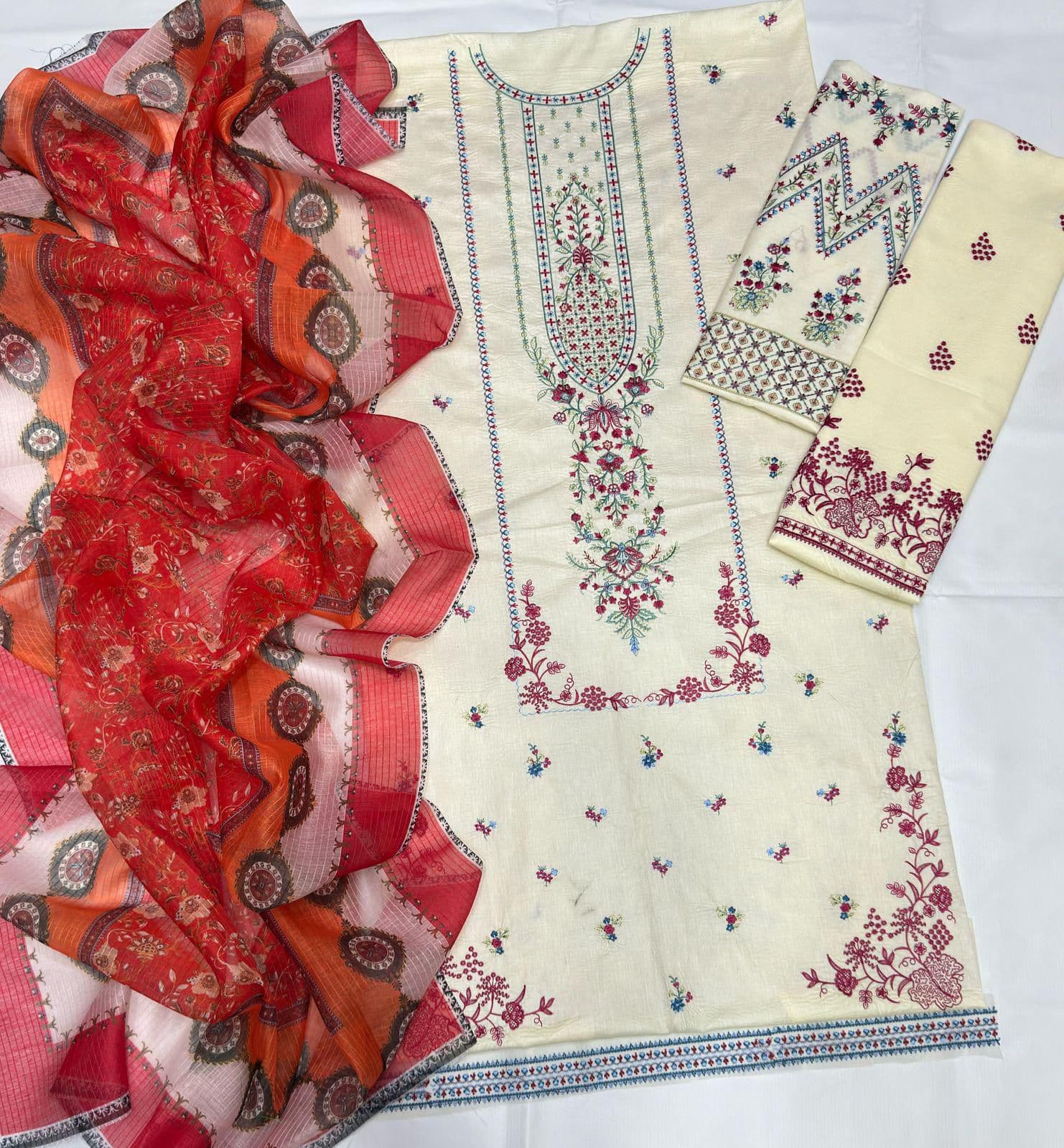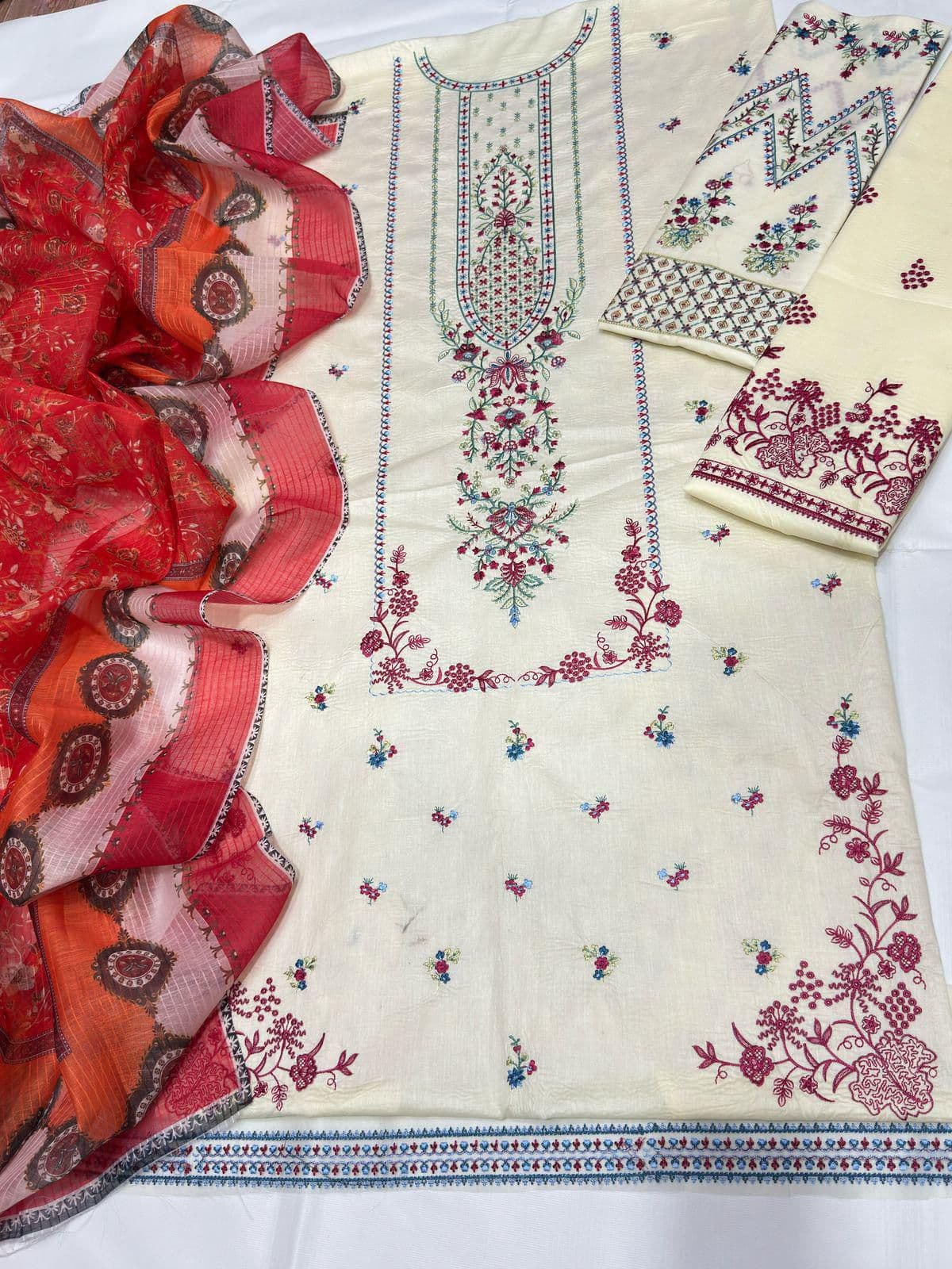 Fabric & Patch Details Shirt: Fully embroidered lawn shirt Sleeves: Embroidered sleeves Front Panel: Embroidered front panel patch Trouser: Embroidered lawn trouser Dupatta: Printed chiffon dupatta Suit Type: 3 Piece Unstitched