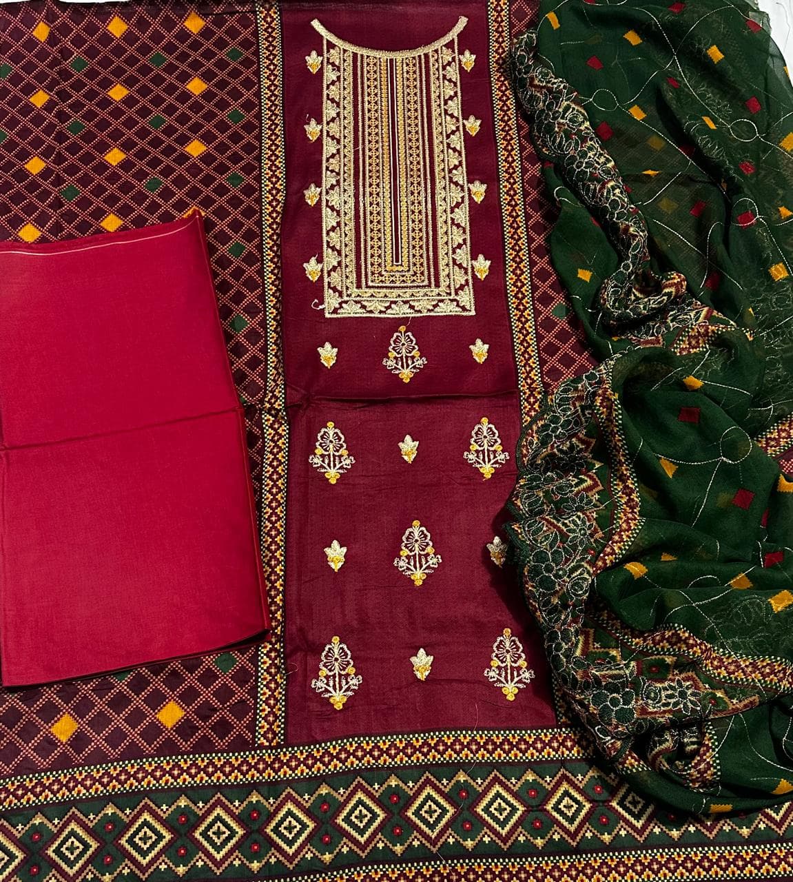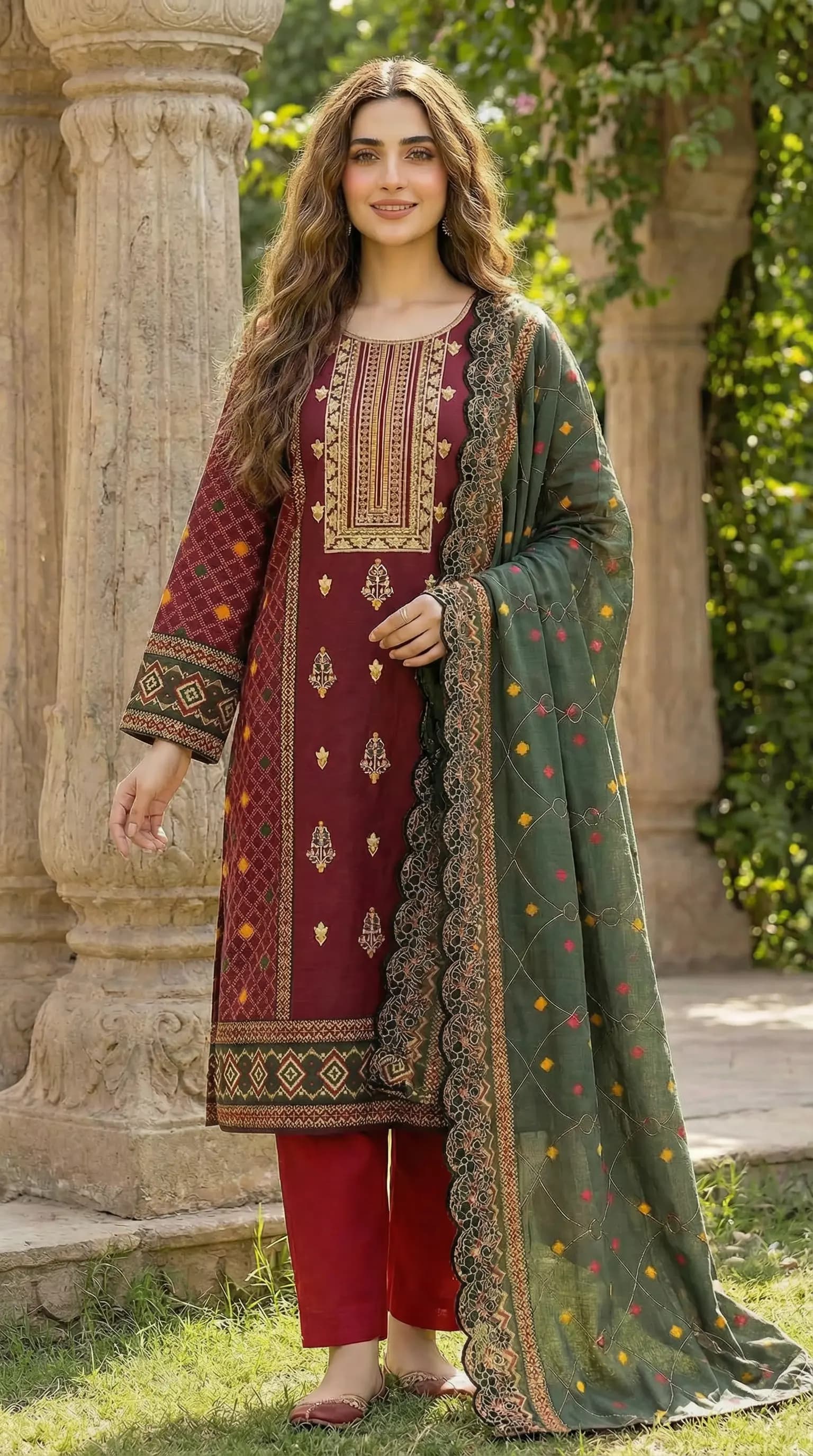 Patches & Details: Printed lawn shirt with fine embroidery Premium quality, soft and breathable lawn fabric Plain lawn trouser for a clean, elegant look Lightweight chiffon dupatta with delicate cut-work Unstitched 3 piece women suit Ideal for Pakistani summer wear