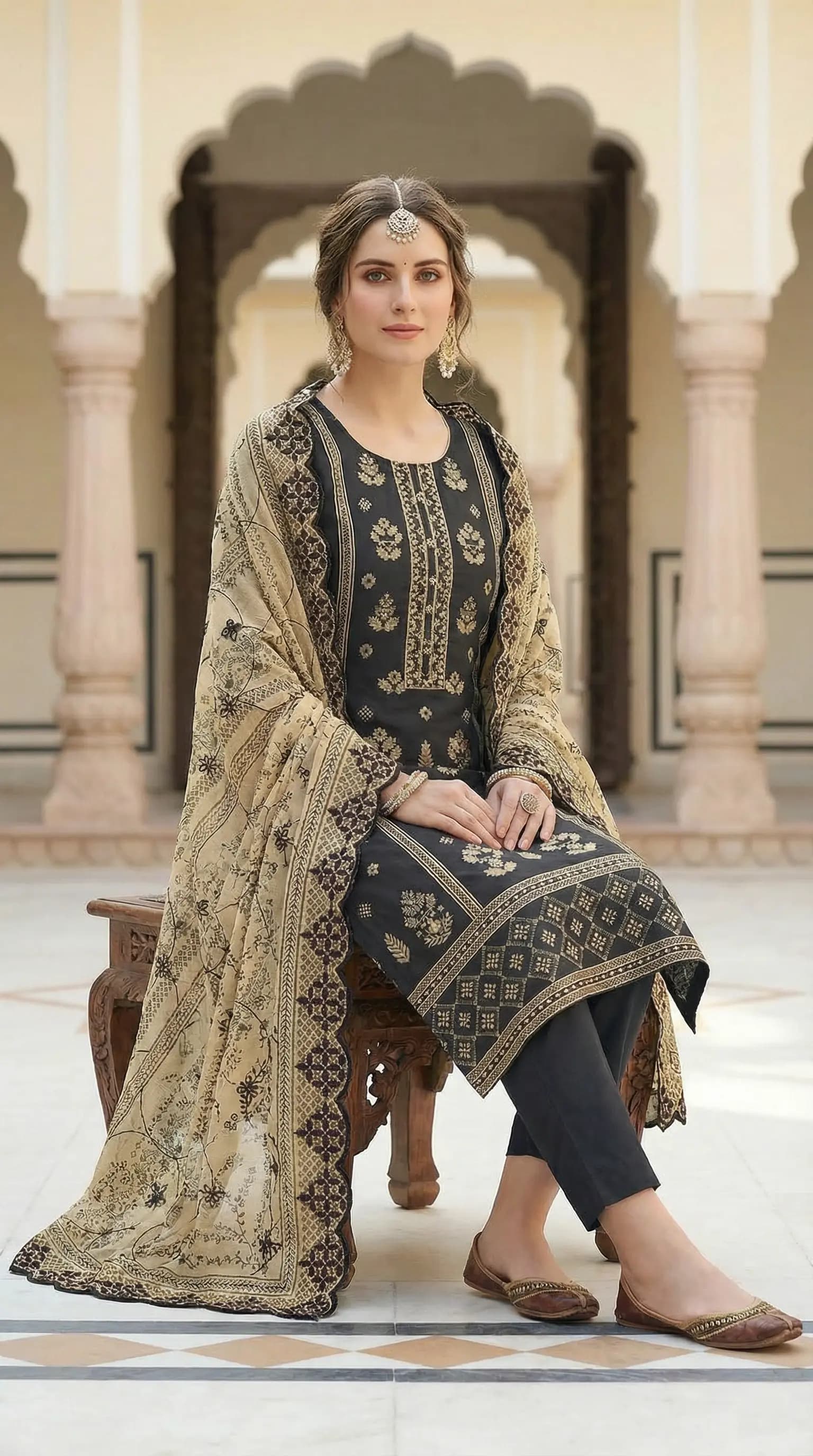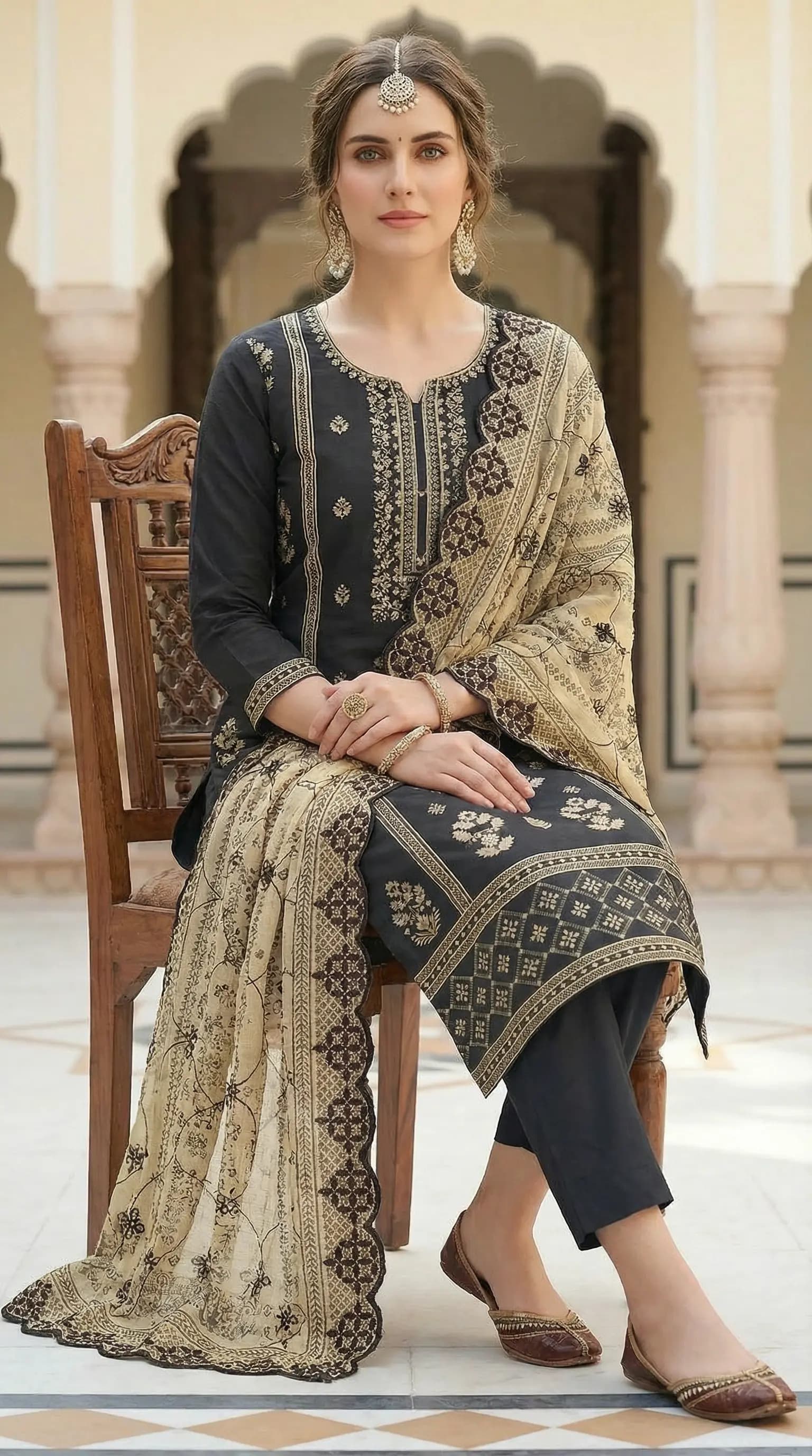 23% offA stylish printed lawn 3 piece suit crafted for summer comfort, featuring a beautifully embroidered shirt, a plain trouser, and a lightweight chiffon dupatta enhanced with elegant cutwork.