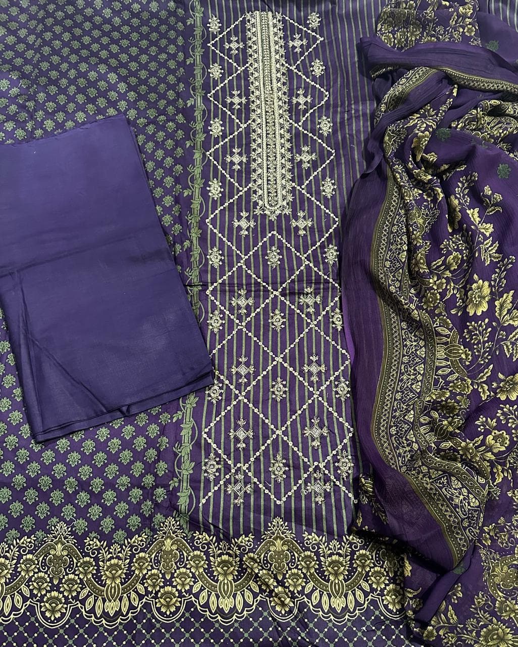 Patches & Details Printed lawn shirt with elegant embroidery Premium quality, breathable lawn fabric Printed lawn trouser for a coordinated look Lightweight chiffon dupatta Unstitched 3 piece women suit Ideal for summer wear in Pakistan